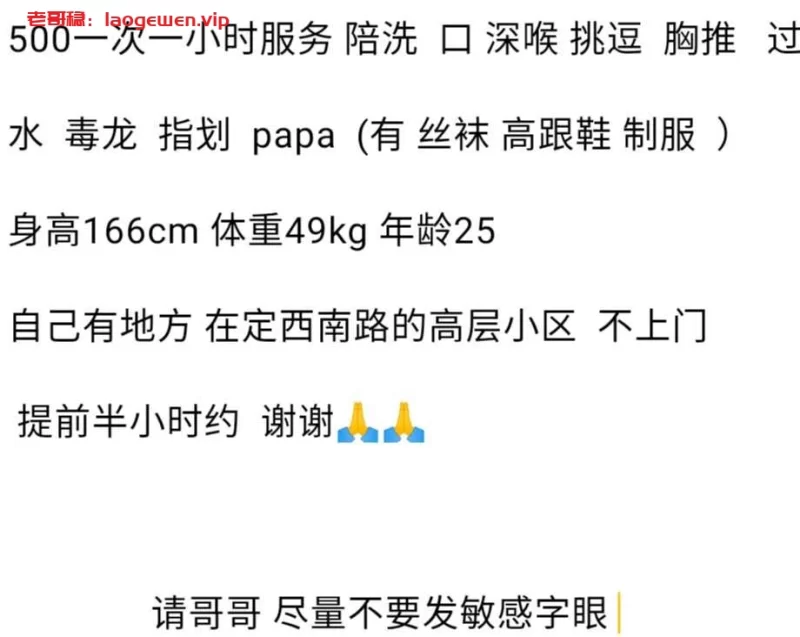 信息分类:楼凤兼职 地区:甘肃省-兰州 信息来源:微信 小姐数量:1 小姐年龄:25 小姐素质:80 小姐外形:80 服务项目:全套 价格:500 营业时间:24 环境设备:自己有租房 安全评估:100 详细地址:本段信息已隐藏,请先登陆。点击登陆 , 或者 点击注册 联系方式:本段信息已隐藏,请先登陆。点击登陆 , 或者 点击注册 综合评价:最近资源紧张,特地贡献给各位 详细介绍: 最近资源较少,特地分享给大家 楼凤兼职
